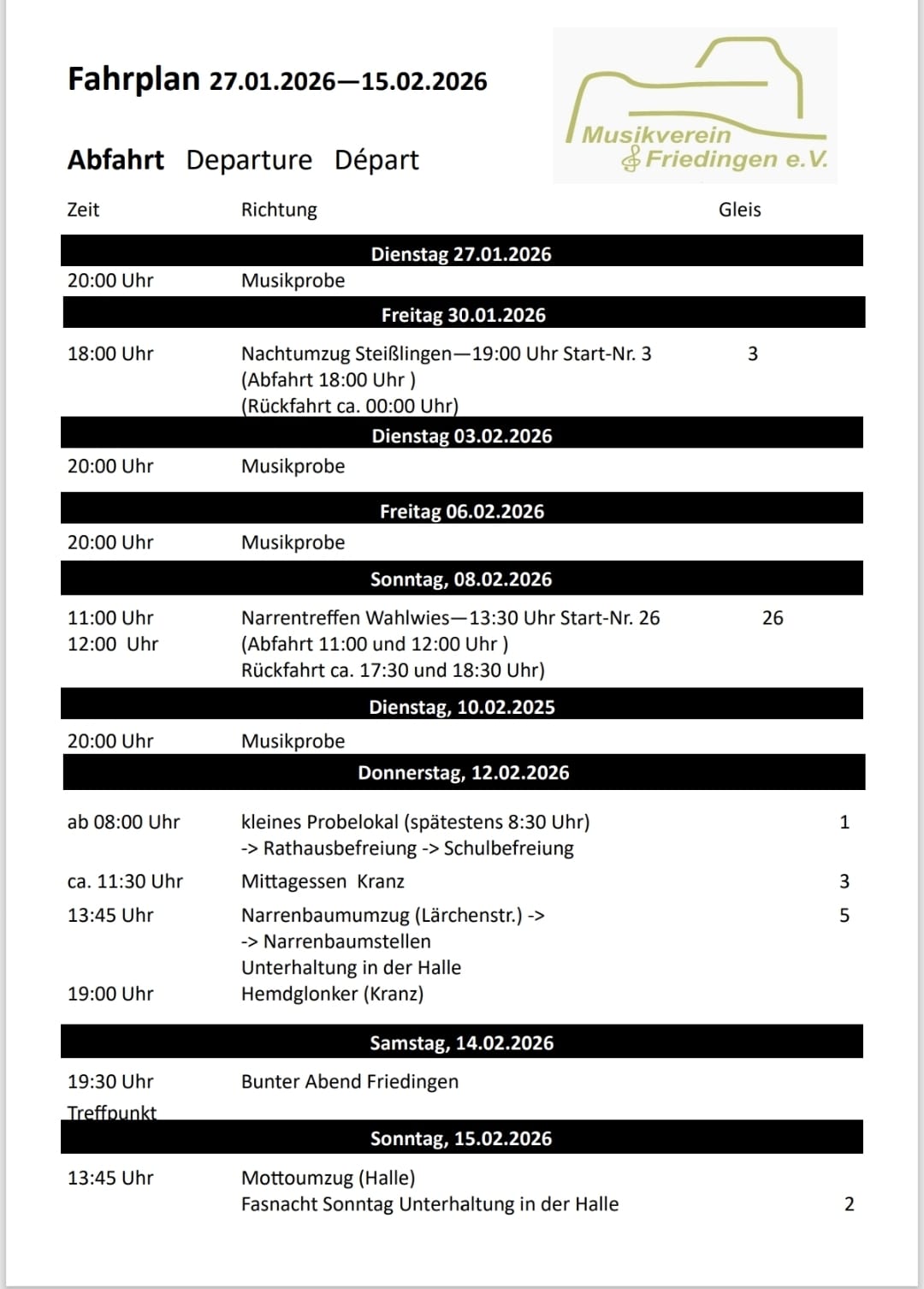 Und da ist er wieder...der Fahrplan für die kommende Fasnet. Start ist am Freitag in Steißlingen. Dann über Wahlwies nach Friedingen!